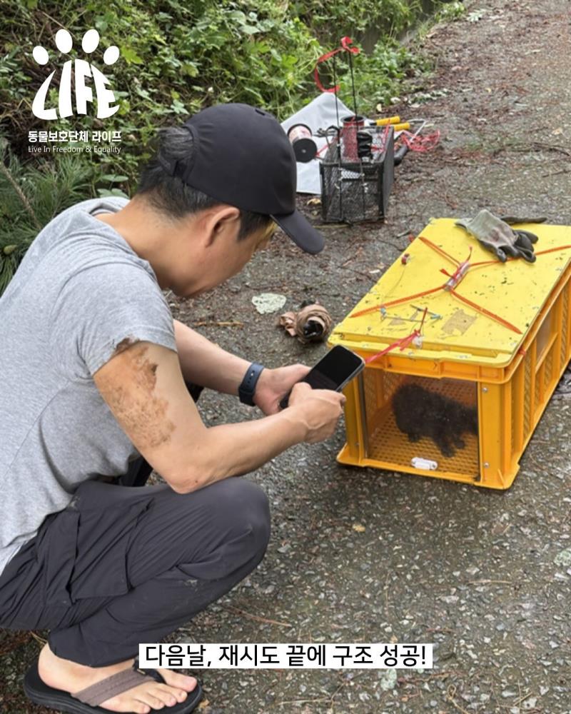 제보자는 가지고 있던 간식과 사료를 떨어트려주었고, 잠시 기다리니 허겁지겁 먹는 새끼 고양이를 볼 수 있었습니다. 라이프는 전화를 받고 급히 일정을 잡아 구조에 나섰습니다.