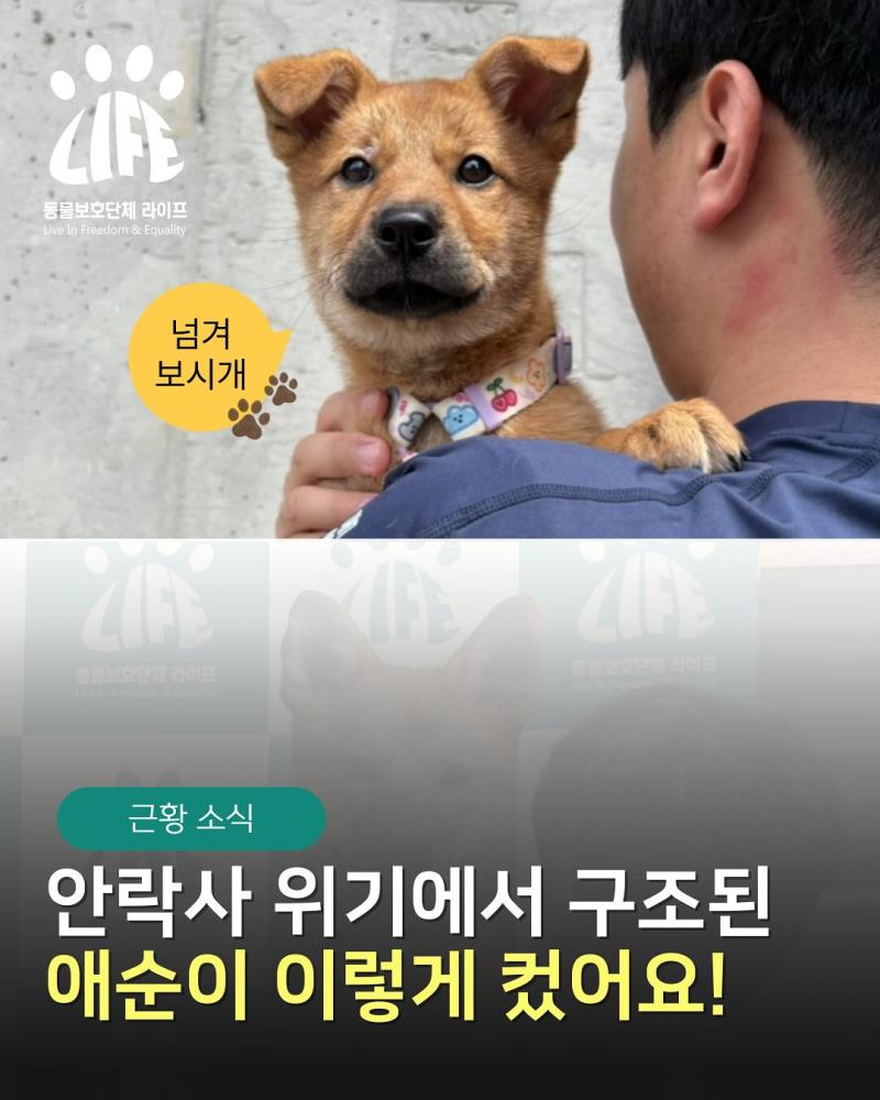 보호소 통폐합으로 안락사 위기에 놓였던 ‘애순이’선천적 장애가 의심되는 상황에 거동도 못하고 작은 철장 구석에 누워만 있던 아기 ‘애순이’가 라이프의 가족이 된지도 반년이 넘었어요!예전 사진과 비슷한 구도로 찍어보니 정말 많이 컸다는 게 느껴지더라구요. 표정도 많이 밝아지고 똥꼬발랄 하답니다.여러분이 함께 만들어주신 ‘애순이’의 변화! 보이시나요?